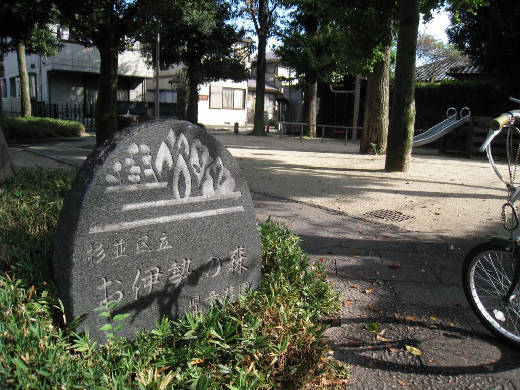 公園は小さなすべり台とブランコがあるだけで、ミニ広場という雰囲気ですが、入口に「お伊勢の森児童遊園」の表示があり、ようやく「お伊勢の森」ゆかりの地に辿り着いたようです。ざっと見る限り、その由来を記したような説明板も見当たらないので、後日調べてみたところ、この公園とバス停の間にある杉森中学校付近が、現在は阿佐ヶ谷駅の北にある神明宮(天祖神社)の旧社地であり、伊勢神宮同様に天照大神を祭神としたことから、境内をお伊勢の森と俗称したとのこと。神明社の移転は江戸中期の頃のようですが、戦前の杉並区の地図では、旧社地に「御伊勢の森」の表記があり、神明社移転後もこの付近に「お伊勢の森」の地名が定着していたものと思われます。杉森中学校の校舎落成が戦後の昭和30年頃のようですから、その頃を境に「森」は急速に消滅していったのでしょう。