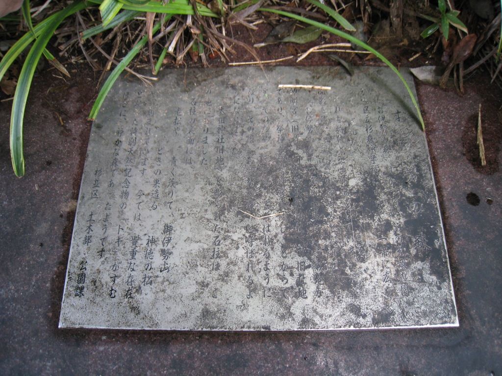 公園を後にしようとしたところ、北西角の茂みの中に何やら説明書きのようなものが。もしやと思い草をかき分けてみると、そこには区が設置した碑が埋没しているではありませんか。土を掃って読んでみると、「天祖神社旧地」と彫られた石柱がこの地にあったこと、その石柱の裏面には「老松や 青く茂りて 御伊勢山 ときの巣造る 神徳の松」と刻まれていたことなどが、簡単に記されています。すぐ横に二羽のトキの像があるのは、これに因んでのことでしょう。